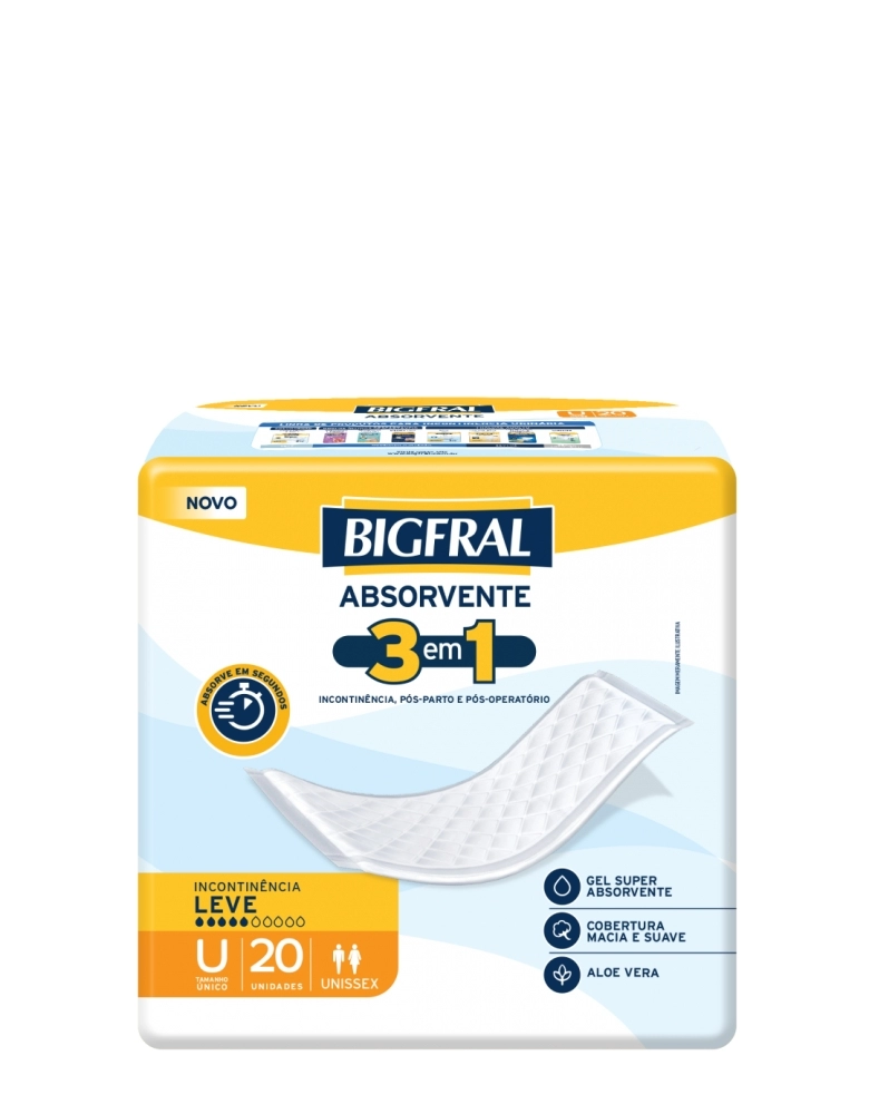 O absorvente Bigfral Regular Plus é desenvolvido para incontinência urinária leve a moderada, garantindo proteção. Possui rápida absorção, canais de distribuição, gel superabsorvente, mantendo a pele mais seca. Garante conforto, com uma cobertura macia e suave. PELE MAIS SECA, VOCÊ MAIS SEGURO.