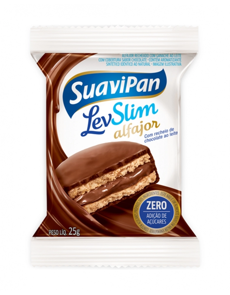 Ingredientes: OS INGREDIENTES DO ALFAJOR AO LEITE SUAVIPAN LEVSLIM SÃO GANACHE SABOR CHOCOLATE AO LEITE (ÓLEO VEGETAL, CACAU EM PÓ, LEITE EM PÓ INTEGRAL, LEITE EM PÓ DESNATADO, GORDURA VEGETAL, EDULCORANTES: MALTITOL E SUCRALOSE, EMULSIFICANTES: LECITINA DE SOJA E POLIGLICEROL POLIRRICINOLEATO E AROMATIZANTE), COBERTURA SABOR CHOCOLATE AO LEITE (GORDURA FRACIONADA, CACAU EM PÓ, MALTODEXTRINA, LEITE EM PÓ INTEGRAL, SORO DE LEITE, EDULCORANTE MALTITOL, EMULSIFICANTES: LECITINA DE SOJA E PLIGLICEROL POLIRRICINOLEATO E AROMATIZANTES), FARINHA DE TRIGO ENRIQUECIDA COM FERRO E ÁCIDO FÓLICO, AMIDO DE MILHO, MARGARINA, POLIDEXTROSE, OVO, EDULCORANTES: MALTITOL E SORBITOL, FERMENTOS QUÍMICOS: BICARBONATO DE SÓDIO E BICARBONATO DE AMÔNIA, EMULSIFICANTE LECITINA DE SOJA, CONSERVADOR PROPIONATO DE CÁLCIO E AROMATIZANTE. ALÉRGICOS: CONTÉM OVO, DERIVADOS DE TRIGO, DE SOJA E DE LEITE. O ALFAJOR AO LEITE SUAVIPAN LEVSLIM PODE CONTER AMENDOIM E CASTANHA DE CAJU. O ALFAJOR AO LEITE SUAVIPAN LEVSLIM CONTÉM GLÚTEN.