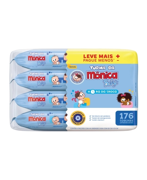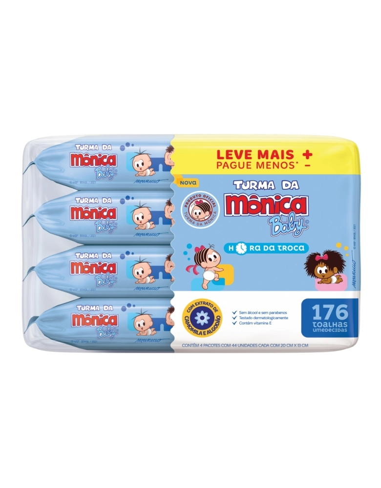 Toalhas Umedecidas Turma da Mônica Baby! Dermatologicamente testadas, as toalhas umedecidas Hora da Troca da Turma da Mônica Baby possuem extrato de camomila e algodão, garantindo hidratação e um toque suave e delicado para o momento da troca de fraldas do seu bebê. Contém 4 pacotes com 44 unidades cada com 20x13 cm, total de 176 toalhas umedecidas.