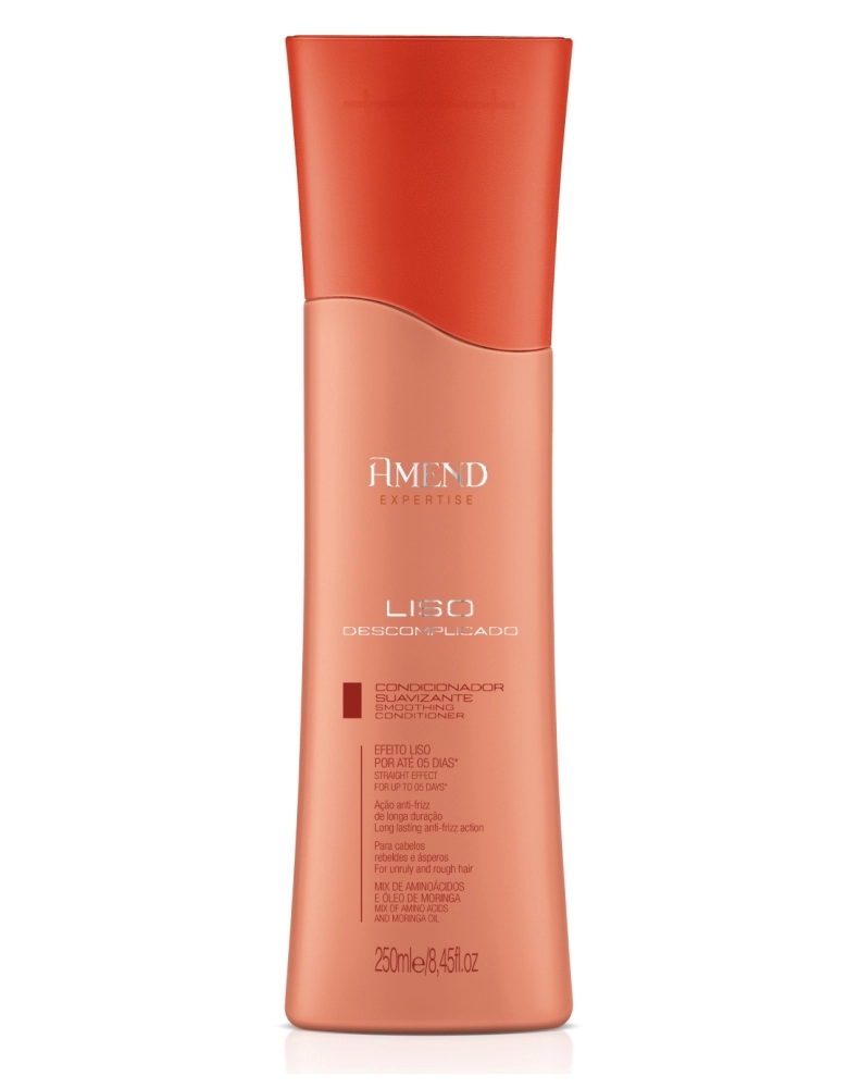 Condicionador Suavizante Amend Expertise Liso Descomplicado: Com fórmula ultra avançada garante até 05 dias* de cabelos lisos (quando usado em conjunto com demais produtos da linha de acordo com o modo de uso). Com ação antifrizz nutre intensivamente o fio rebelde. Prossiga o processo aplicando o Leave-in Suavizante da linha. Dermatologicamente testado