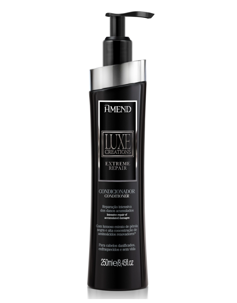 Condicionador Amend Luxe Creations Extreme Repair é elaborado com alta concentração de ativos que reparam intensamente os danos acumulados causados pelo estresse mecânico, químico, térmico e ambiental. Combatem os sinais de envelhecimento capilar (cabelos opacos, fracos e desidratados), evitam o desbotamento da cor e recuperam rapidamente os fios mantendo-os hidratados, fortes, brilhantes e com a cutícula selada.