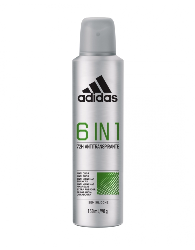 O desodorante aerossol antitranspirante Adidas 6 in 1 possui tecnologia anti odor, anti suor, previne manchas brancas e amarelas, possui extra frescor e fragrância duradoura. O desodorante aerossol antitranspirante Adidas 6 in 1 é dermatologicamente testado tem fórmula vegana com 0% álcool e 0% silicone, respeitando o pH da pele.