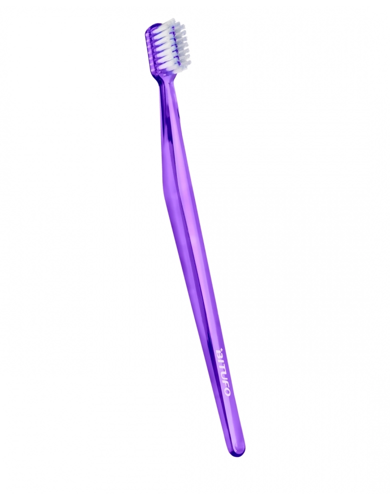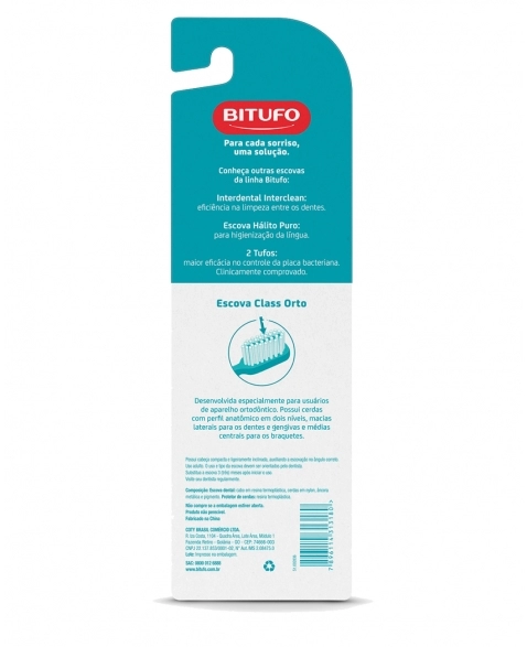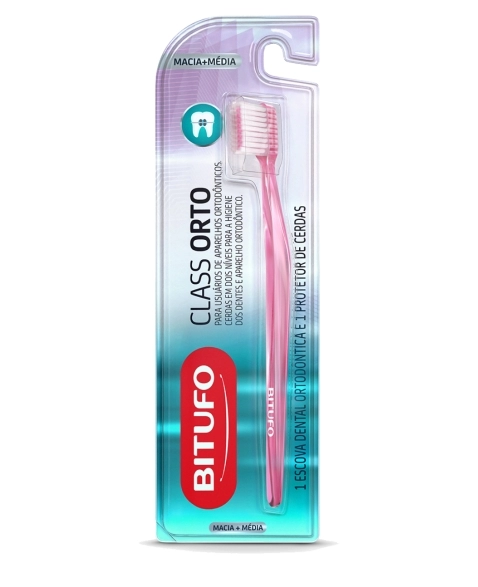 A linha Bitufo Ortodontia foi idealizada para atender a todas as necessidades dos usuários de aparelhos ortodônticos. A escova foi desenhada por dentistas e possui cerdas em dois níveis: macias nas laterais para dentes e gengivas e médias nas centrais para escovação do aparelho.