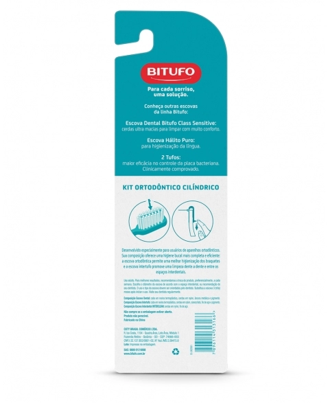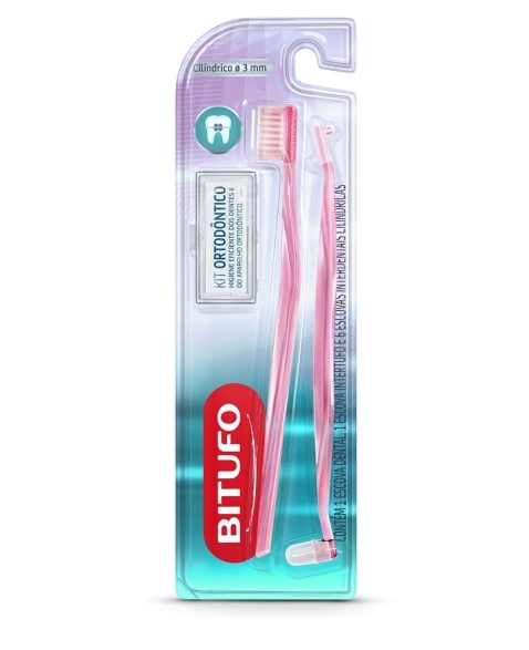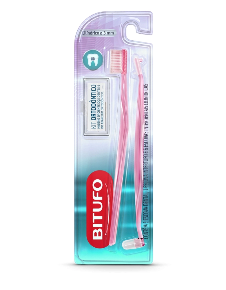 A linha Bitufo Ortodontia foi idealizada para atender a todas as necessidades dos usuários de aparelhos ortodônticos. O kit contém uma escova ortodôntica, uma escova intertufo e um refil interdental, garantindo uma solução completa e eficiente para higienizar dentes e aparelhos.