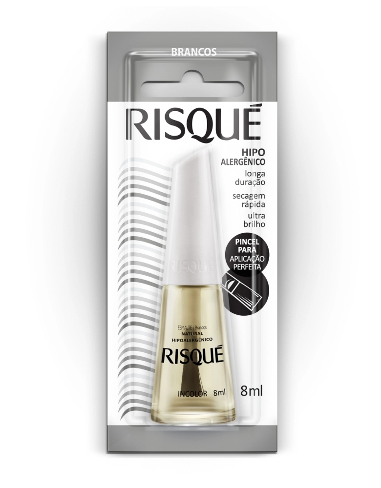 O esmalte Risqué Incolor possui secagem rápida e ultra brilho, além de ter longa duração nas unhas. Sua fórmula é hipoalergênica, isto é, livre de componentes que costumam causar alergias e seu pincel proporciona aplicação perfeita e alta cobertura. Discreto e elegante, o Esmalte Risqué Incolor é perfeito para ser usado em todas as ocasiões.