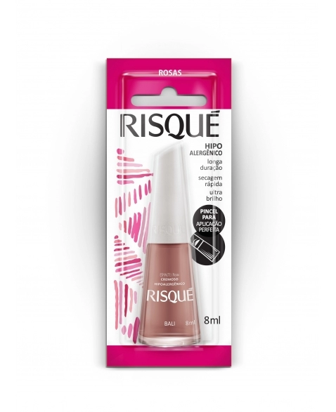 Veja a beleza no mundo e em você com o Esmalte Risqué Rosas Cremoso Bali. Toda a linha de esmaltes Risqué Rosas Cremoso, além de apresentar textura única e cores marcantes, acompanha as tendências da moda, possibilitando diversas composições de looks e maximizando a beleza da sua maquiagem e acessórios. Com secagem rápida, use a sua imaginação e crie lindas nails art que farão sucesso aonde quer que você vá. Com fórmula especial, livre de componentes que costumam causar alergias, o Esmalte Risqu