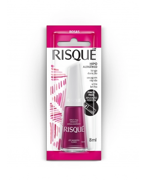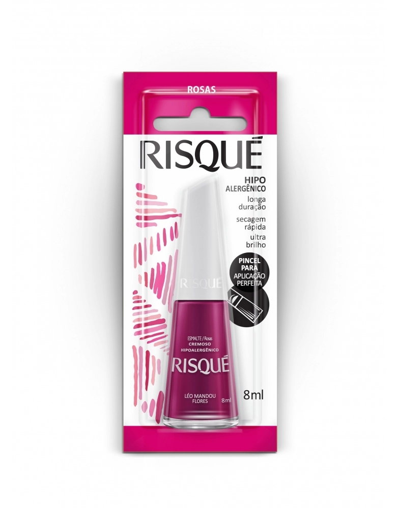 Toda a linha de esmaltes Risqué Rosas Cremoso, além de apresentar textura única e cores marcantes, acompanha as tendências da moda, possibilitando diversas composições de looks e maximizando a beleza da sua maquiagem e acessórios. Com secagem rápida, use a sua imaginação e crie lindas nails art que farão sucesso aonde quer que você vá. Com fórmula especial, livre de componentes que costumam causar alergias, o Esmalte Risqué é perfeito para os cuidados diários. Apaixone-se pela cor, presencie a l