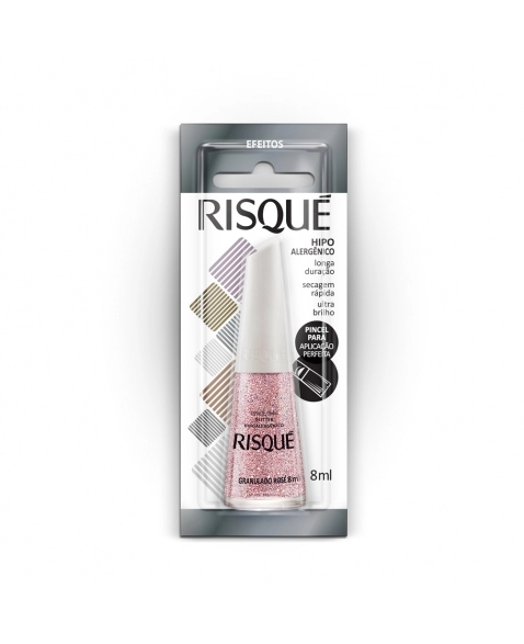 Toda a linha de esmaltes Risqué Efeitos Glitter, além de apresentar textura única e cores cheias de brilho, acompanha as tendências da moda, possibilitando diversas composições de looks e maximizando a beleza da sua maquiagem e acessórios. Com secagem rápida, use a sua imaginação e crie lindas nails art que farão sucesso aonde quer que você vá. Com fórmula especial, livre de componentes que costumam causar alergias, o Esmalte Risqué é perfeito para os cuidados diários. Apaixone-se pela cor, pres