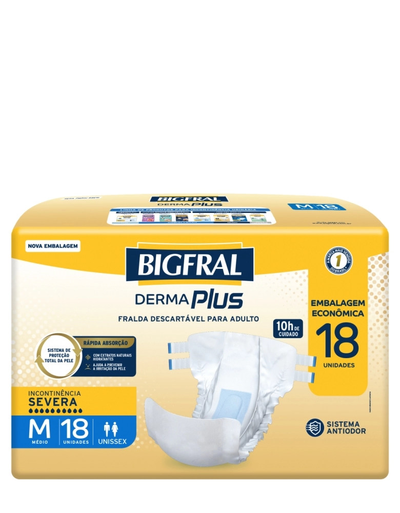 A Bigfral DermaPlus é a primeira fralda para adultos com extratos naturais hidratantes, que ajudam a previnir irritações, mantendo a pele protegida e saudável, além de garantir até 10h de cuidado para pessoas com incontinência urinária severa. O Sistema Antiodor neutraliza odores, trazendo a sensação de frescor da pele. PROTEÇÃO E CUIDADO SUPERIOR PARA SUA PELE.