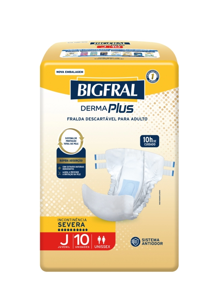 A Bigfral DermaPlus é a primeira fralda para adultos com extratos naturais hidratantes, que ajudam a previnir irritações, mantendo a pele protegida e saudável, além de garantir até 10h de cuidado para pessoas com incontinência urinária severa. O Sistema Antiodor neutraliza odores, trazendo a sensação de frescor da pele. PROTEÇÃO E CUIDADO SUPERIOR PARA SUA PELE.