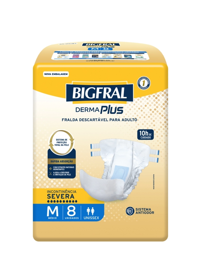 A Bigfral DermaPlus é a primeira fralda para adultos com extratos naturais hidratantes, que ajudam a previnir irritações, mantendo a pele protegida e saudável, além de garantir até 10h de cuidado para pessoas com incontinência urinária severa. O Sistema Antiodor neutraliza odores, trazendo a sensação de frescor da pele. PROTEÇÃO E CUIDADO SUPERIOR PARA SUA PELE.