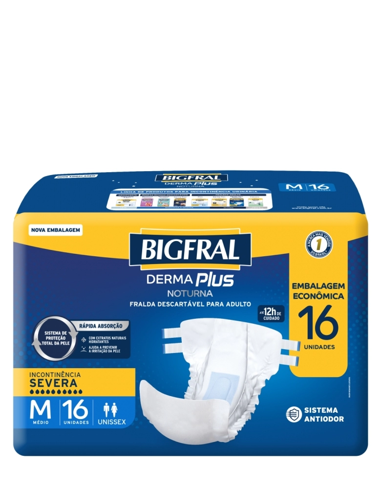 A Bigfral DermaPlus Noturna foi desenvolvida para adultos com incontinência urinária severa. Possui o exclusivo sistema de proteção total da pele, com extratos naturais hidratantes, que ajudam a prevenir irritações, mantendo a pele protegida e saudável, além de garantir até 12h de cuidado para noites tranquilas. O Sistema Antiodor neutraliza odores, trazendo a sensação de frescor da pele.