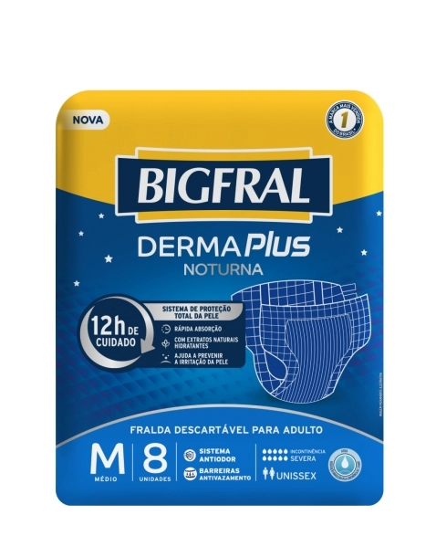 A linha Bigfral Noturna foi desenvolvida com a mais alta tecnologia e qualidade para pessoas que necessitam de cuidados especiais, com incontinência severa, oferecendo até 12h de proteção máxima. A fralda possui a exclusiva tecnologia antiodor, alta absorção com uma camada extra absorvente, gel superabsorvente, difusor de líquidos, barreiras antivazamento aliados a seu formato anatômico, indicador de umidade e aloe vera. O produto é hipoalergênico e dermatologicamente testado, contando ainda com