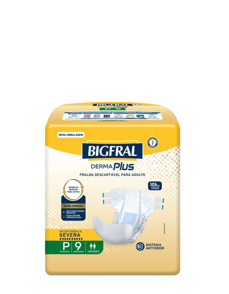 A Bigfral DermaPlus é a primeira fralda para adultos com extratos naturais hidratantes, que ajudam a previnir irritações, mantendo a pele protegida e saudável, além de garantir até 10h de cuidado para pessoas com incontinência urinária severa. O Sistema Antiodor neutraliza odores, trazendo a sensação de frescor da pele. PROTEÇÃO E CUIDADO SUPERIOR PARA SUA PELE.