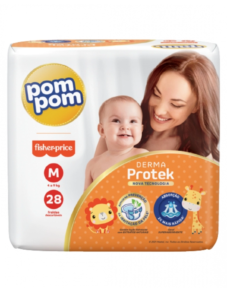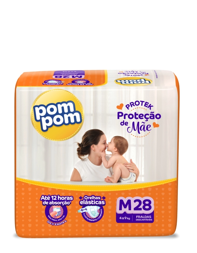 Pom Pom Protek Proteção de Mãe é a proteção que cuida do seu bebê por até 12 horas, garantindo dias e noites tranquilas, com orelhas elásticas que garantem mais conforto e um ajuste perfeito na cinturinha do bebê, e canal superabsorvente que distribui o xixi mais rápido, evitando que a fralda pese e caia entre as perninhas do bebê.
