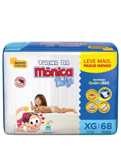 Fralda Turma da Mônica com tecnologia Qu4troSec! Possui um exclusivo sistema de canal que distribui mais rápido o xixi, barreiras antivazamento e uma fina camada extra que ajuda a manter o bebê sequinho por até 12 horas, além de ter cintura elástica, que proporciona um perfeito ajuste no corpinho, assim ele fica calmo, tranquilo e seguro durante o dia e a noite toda.