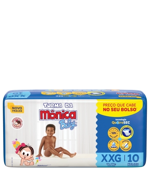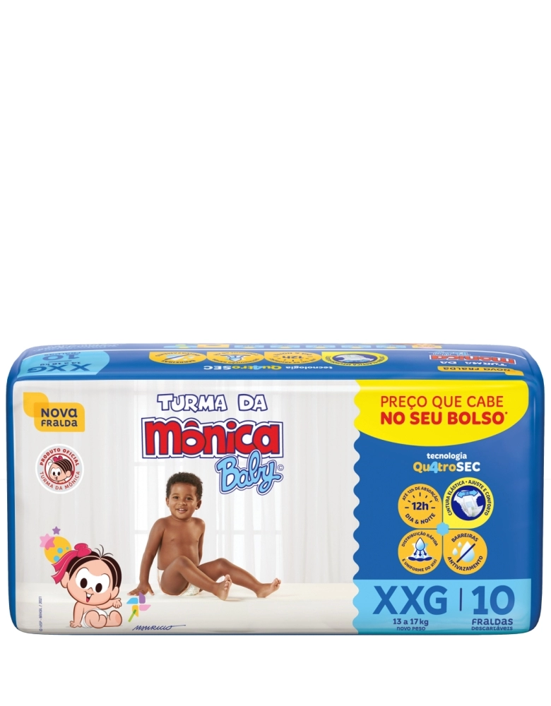 Fralda Turma da Mônica com tecnologia Qu4troSec! Possui um exclusivo sistema de canal que distribui mais rápido o xixi, barreiras antivazamento e uma fina camada extra que ajuda a manter o bebê sequinho por até 12 horas, além de ter cintura elástica, que proporciona um perfeito ajuste no corpinho, assim ele fica calmo, tranquilo e seguro durante o dia e a noite toda.
