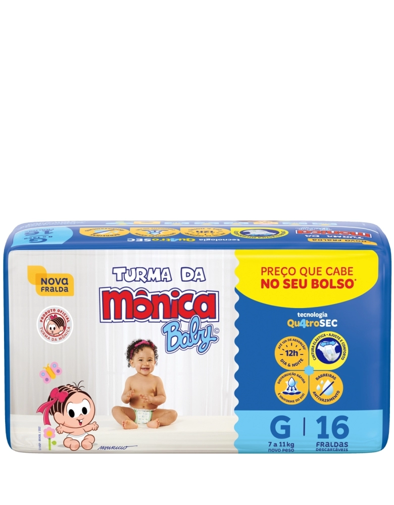 Fralda Turma da Mônica com tecnologia Qu4troSec! Possui um exclusivo sistema de canal que distribui mais rápido o xixi, barreiras antivazamento e uma fina camada extra que ajuda a manter o bebê sequinho por até 12 horas, além de ter cintura elástica, que proporciona um perfeito ajuste no corpinho, assim ele fica calmo, tranquilo e seguro durante o dia e a noite toda.