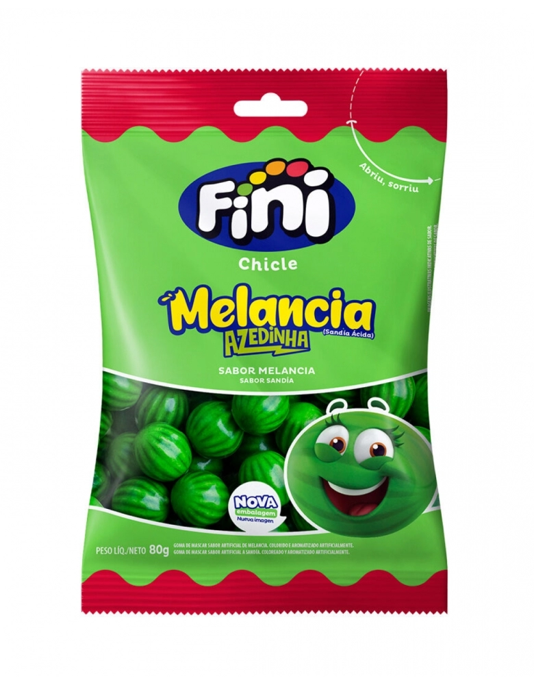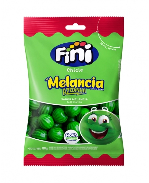 Experimente a refrescância do Chicle Melancia Fini. É azedinho e tem um formato que lembra uma melancia, este chicle é vermelho por dentro e possui bolinhas pretas, simulando sementes. Pacote com 80g de produto.