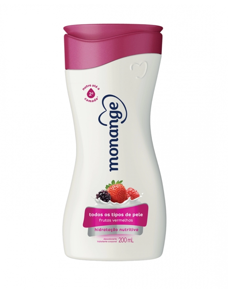 Indicado para todos os tipos de pele, o Hidratante Monange Hidratação Nutritiva Frutas Vermelhas hidrata por 48h e ajuda a combater o envelhecimento precoce. Além disso, sua fórmula com frutas vermelhas possui ação desodorante e nutre até a segunda camada (camada subcórnea da epiderme).