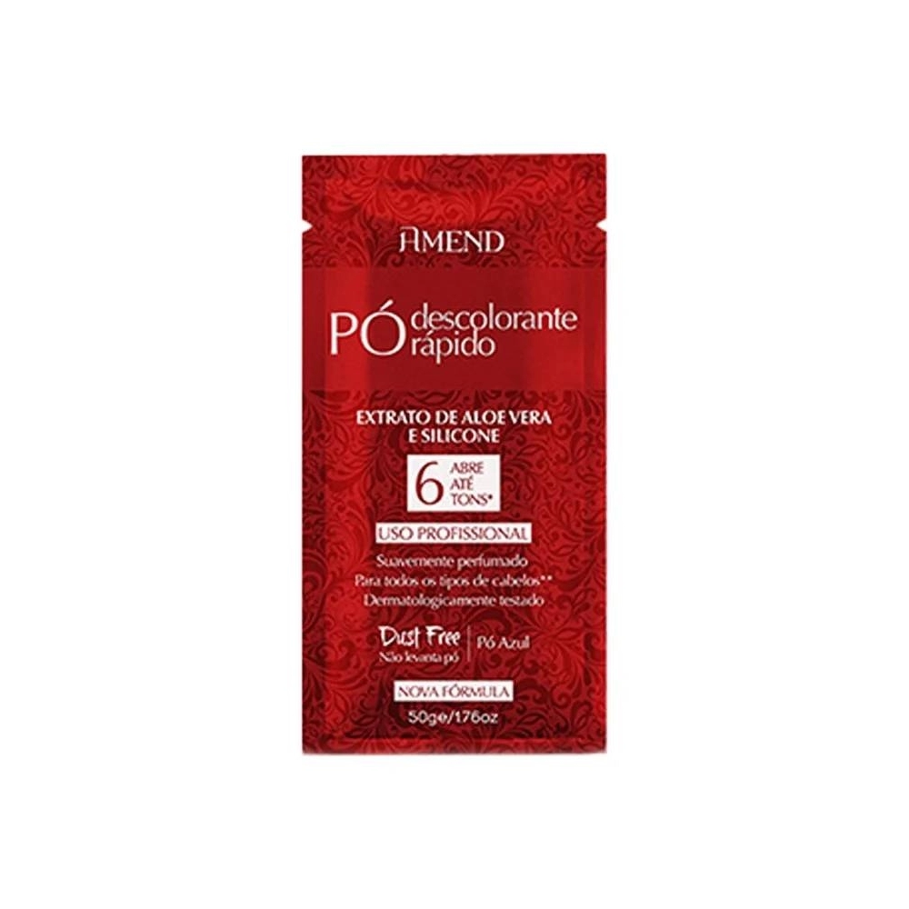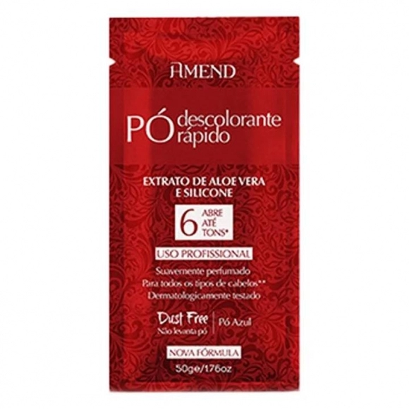 "Abre até 6 tons*. O pó descolorante rápido amend possui extrato de aloe vera e silicone, que formam uma película protetora em volta dos fios, deixando os cabelos fáceis de pentear, macios e com muito brilho. Apresenta excelente resultado ao agir de forma rápida em técnicas de descoloração como: clareamento total, mechas, reflexos, balayages e luzes. Dermatologicamente testado. Manuseio com agradável perfume, sem levantar pó (dust free). *a abertura de tons varia de acordo com a pigmentação natural, estrutura e porosidade dos fios.
