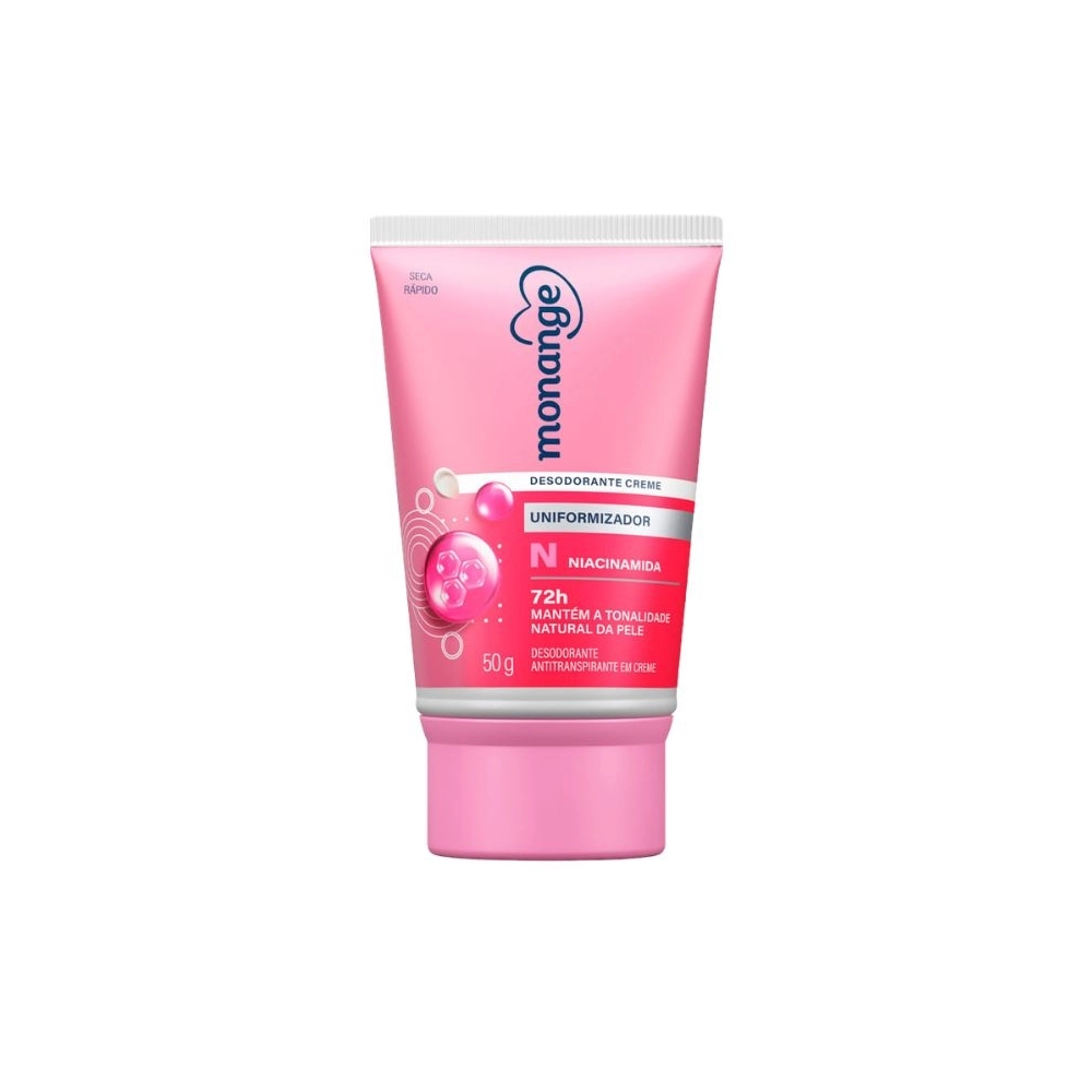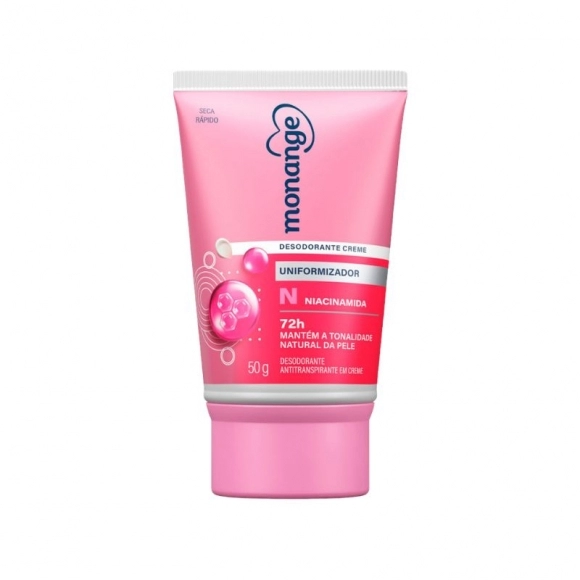 O Desodorante Antitranspirante Creme Monange Uniformizador Feminino 72h 50g é um desodorante em creme uniformizador que oferece 72 horas de proteção contra suor e odor, ao mesmo tempo em que ajuda a uniformizar o tom das axilas. Sua fórmula com niacinamida auxilia no clareamento de áreas escurecidas em até 4 semanas de uso contínuo, mantendo a tonalidade natural da pele sem causar ressecamento. É indicado para todos os tons e tipos de pele.