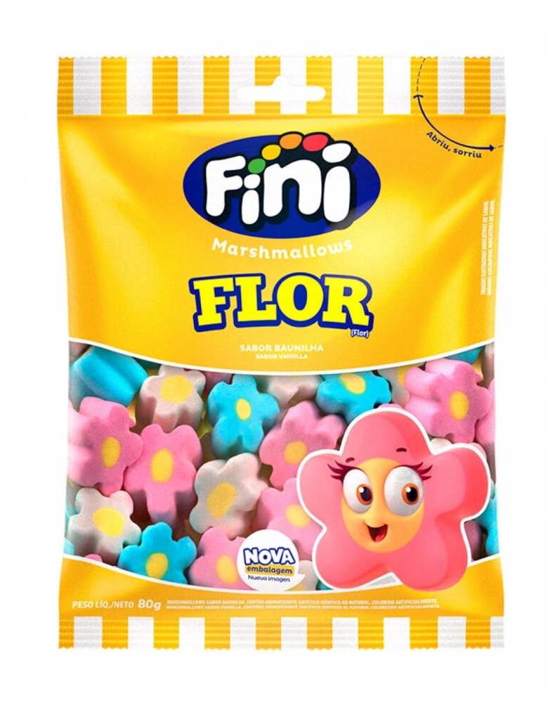 Marshmallow Flor Fini, macios e saborosos, possuem formato de flor. Disponível no pacote as cores azul, rosa e branco, com sabor de baunilha.
