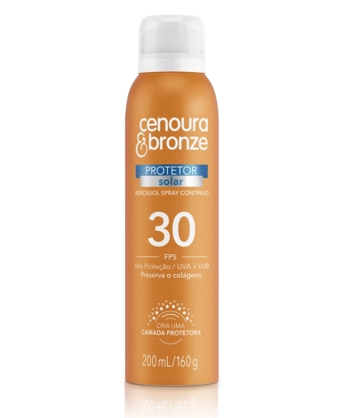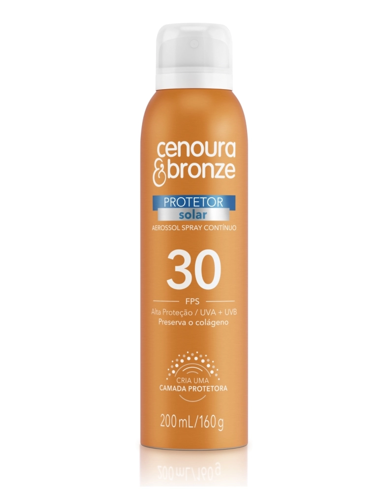 O Protetor Solar Aerossol de Cenoura & Bronze cria uma camada protetora, que protege sua pele contra a ação danosa causada pela radiação solar UVA e UVB. Pode ser usado na pele molhada ou seca, espalha fácil e hidrata sem deixar a pele esbranquiçada. O produto pode ser aplicado também de ponta cabeça, facilitando a distribuição nas pernas e nas costas. Os produtos de proteção solar de Cenoura & Bronze possuem a tecnologia inovadora Preserva o Colágeno, que minimiza os danos mais profundos na pel