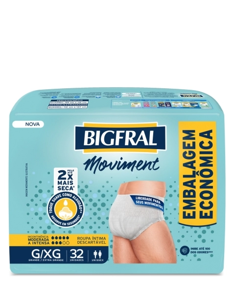 Bigfral Moviment é a roupa íntima descartável ideal para incontinência moderada a intensa, desenvolvida para homens e mulheres. Absorve em segundos mantendo a umidade longe da pele e deixando-a até 2x mais seca. As barreiras de proteção antivazamento e o controle de até 100% dos odores proporcionam segurança para que você desfrute seu dia e se movimente com confiança.