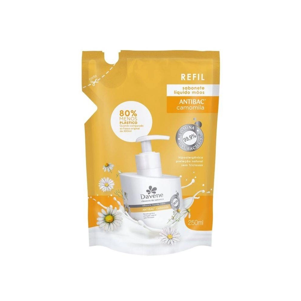 O Refil Sabonete Líquido Clássicos da Natureza Antibac Camomila 250ml da Davene é ideal para quem deseja uma limpeza antibacteriana e ao mesmo tempo delicada, com os benefícios da camomila. Sua fórmula proporciona proteção contra bactérias, hidratação e calmante, além de oferecer uma sensação de frescor e bem-estar. Perfeito para o uso diário, esse refil é ideal para quem procura praticidade, eficácia e um toque suave de frescor.