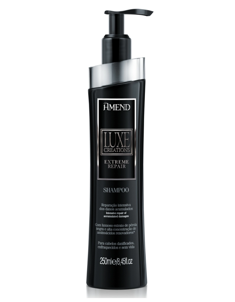 Shampoo Amend Luxe Creations Extreme Repair é elaborado com alta concentração de ativos que reparam intensamente os danos acumulados causados pelo estresse mecânico, químico, térmico e ambiental. Combatem os sinais de envelhecimento capilar (cabelos opacos, fracos e desidratados), evitam o desbotamento da cor e recuperam rapidamente os fios mantendo-os hidratados, fortes e brilhantes.