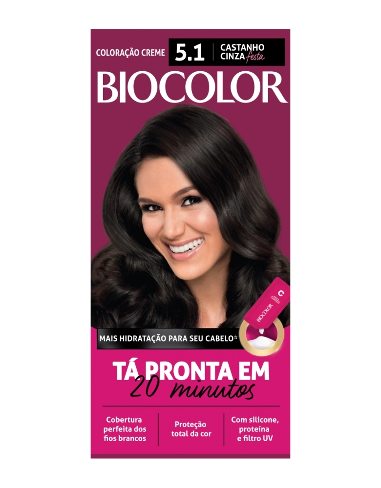 A Tinta de Cabelo Biocolor Mini Kit Castanho Festa 5.1 garante uma cobertura perfeita da cor desejada e proporciona uma cor intensa e duradoura, trazendo a proteção que o cabelo precisa. A versão Mini do produto age em apenas 20 minutos e possui bisnaga de tratamento para os fios que proporciona hidratação e brilho até a próxima aplicação. Sua fórmula, com fragrância suave, tem silicone, proteína e filtro UV.