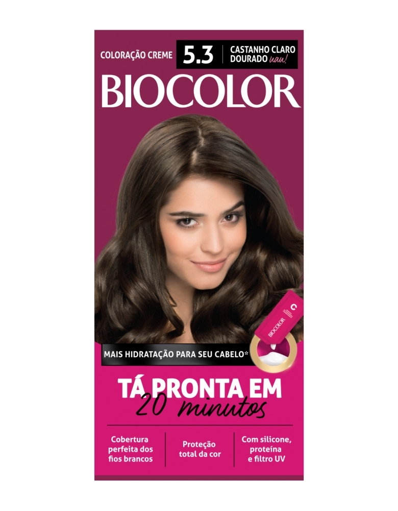 A Tinta de Cabelo Biocolor Mini Kit Castanho Claro Dourado 5.3 garante uma cobertura perfeita da cor desejada e proporciona uma cor intensa e duradoura, trazendo a proteção que o cabelo precisa. A versão Mini do produto age em apenas 20 minutos e possui bisnaga de tratamento para os fios que proporciona hidratação e brilho até a próxima aplicação. Sua fórmula, com fragrância suave, tem silicone, proteína e filtro UV.