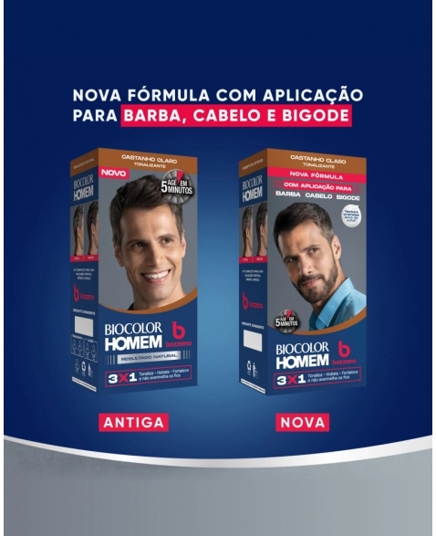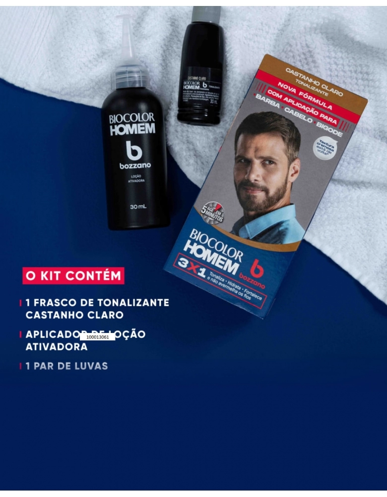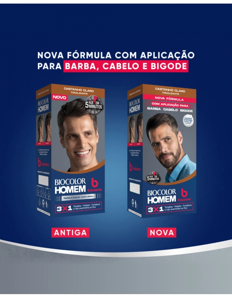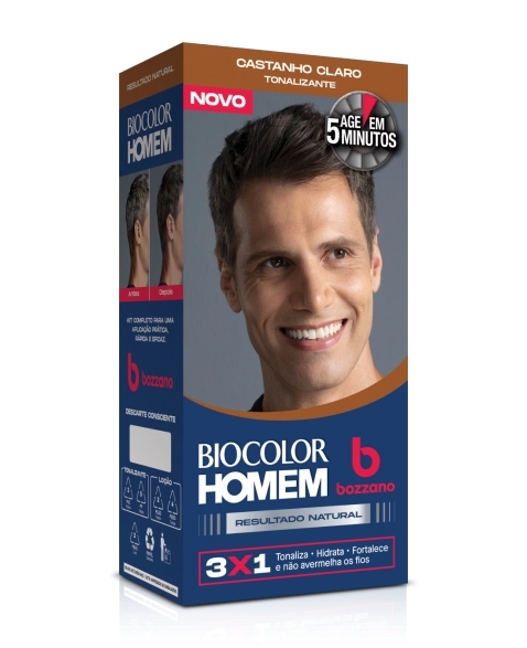 A nova linha de Tonalizantes Biocolor Homem Bozzano volta com aplicação completa para barba, cabelo e bigode! Com a textura cremosa original, promove um resultado de cobertura intensa para os seus cabelos. O novo Tonalizante Castanho Claro 3x1 tonaliza, hidrata e fortalece os fios. Sua fórmula é enriquecida com biopolímeros e é livre de amônia, contendo ingredientes que hidratam os fios enquanto tonalizam, sem avermelhar. Conta com uma ação rápida, que age em apenas 5 minutos, durando até 30 lavagens. É indicado para todos os tipos de cabelo. Esse kit contém 1 tonalizante, 1 loção ativadora e 1 par de luvas.
