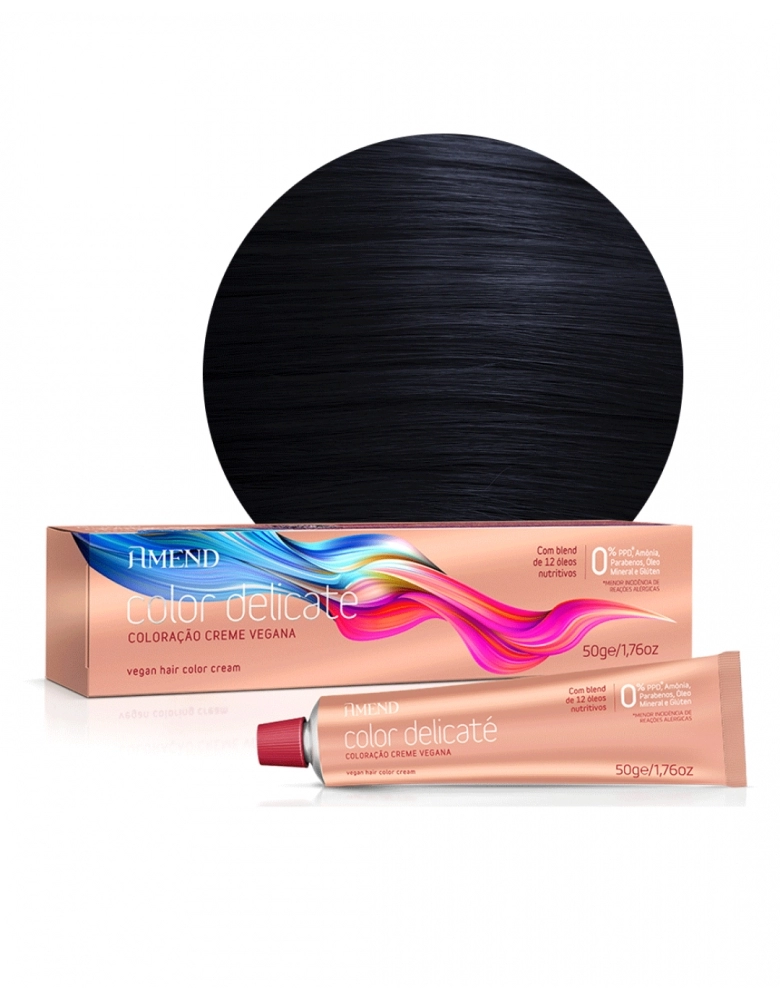 Coloração Amend Color Delicaté 2.1 Preto Azulado creme vegana sem amônia com blend de 12 óleos nutritivos. 0% PPD*, 0% amônia, 0% parabenos, 0% óleo mineral e 0% glúten. Cores com ultradurabilidade e brilho intenso. Excelente cobertura dos cabelos brancos. Proteção contra o ressecamento, nutrição avançada e controle do frizz.