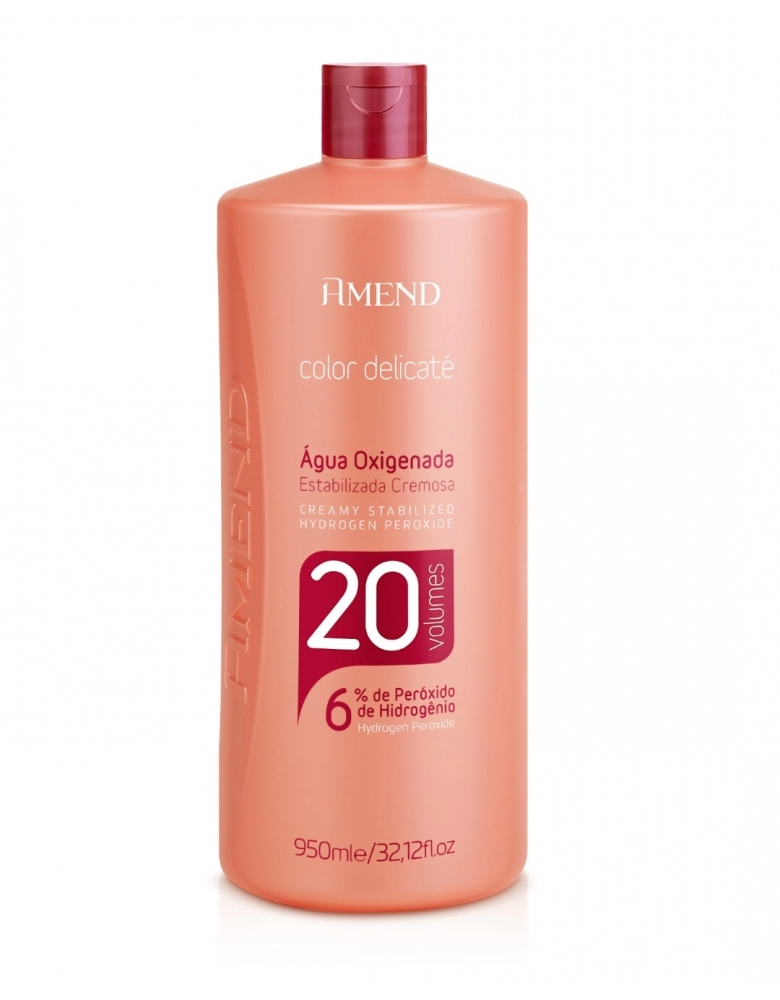 Água Oxigenada Amend Color Delicaté 20 Volumes 950ml; especialmente desenvolvida para o uso com os produtos da linha Amend Color Delicaté. Descolore e auxilia na coloração dos cabelos. SÓ PARA USO PROFISSIONAL.