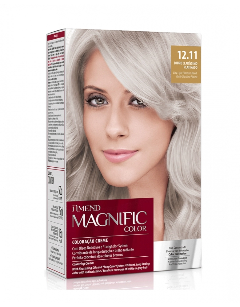 Kit Coloração Amend Magnific Color 12.11 Louro Claríssimo Platinado uma coloração em creme que possibilita cores vibrantes de longa duração e brilho radiante. Sua fórmula é enriquecida com Proteína do Arroz que possui efeito restaurador e protetor, ou seja, a cor dos seus cabelos é renovada e a estrutura capilar preservada. Perfeita cobertura dos cabelos brancos. Finalize o processo de coloração com chave de ouro. Hidrate seus cabelos com concentrado protetor pós coloração color protection. Através de agentes repositores ele atua no fio em profundidade. Repõe a massa capilar protéica e aminoácidos perdidos, promovendo cabelos saudáveis e resistentes. Cabelos e cor protegidos por mais tempo!
