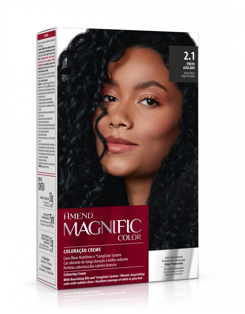 Kit Coloração Amend Magnific Color 2.1 Preto Azulado uma coloração em creme que possibilita cores vibrantes de longa duração e brilho radiante. Sua fórmula é enriquecida com Proteína do Arroz que possui efeito restaurador e protetor, ou seja, a cor dos seus cabelos é renovada e a estrutura capilar preservada. Perfeita cobertura dos cabelos brancos. Finalize o processo de coloração com chave de ouro. Hidrate seus cabelos com concentrado protetor pós coloração color protection. Através de agentes repositores ele atua no fio em profundidade. Repõe a massa capilar protéica e aminoácidos perdidos, promovendo cabelos saudáveis e resistentes. Cabelos e cor protegidos por mais tempo!