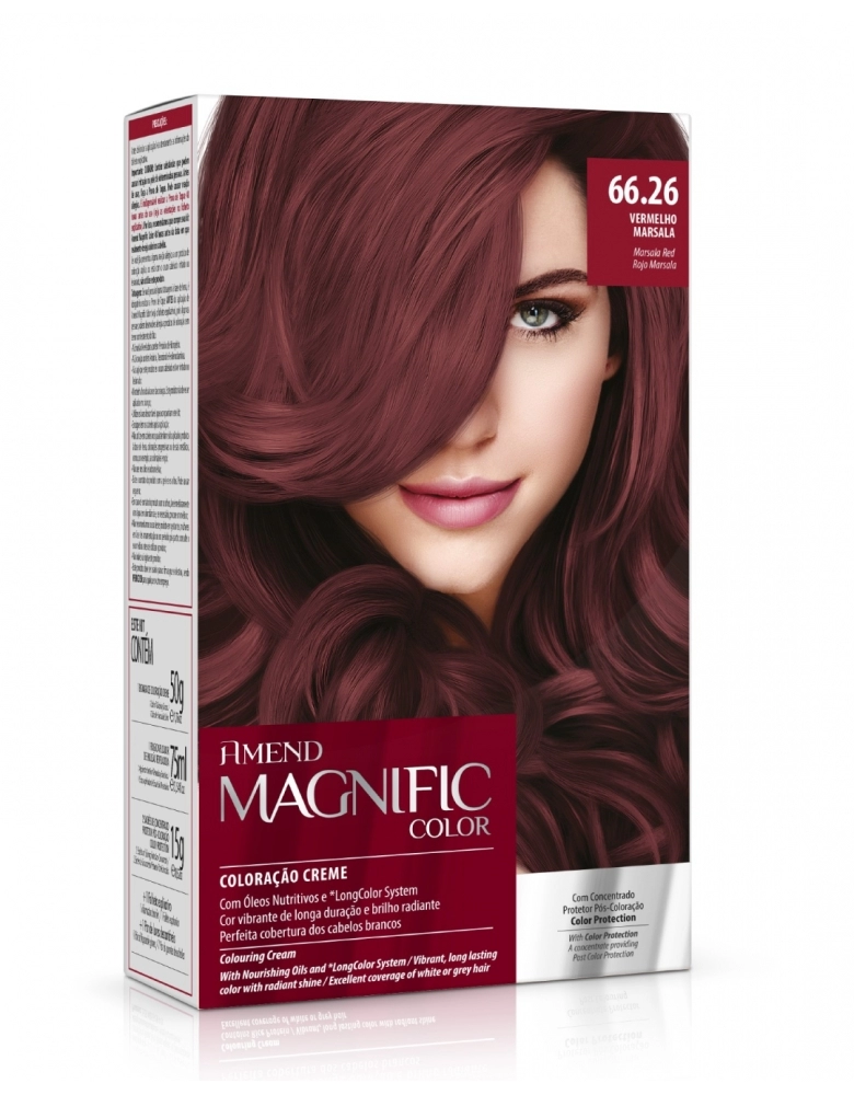 Kit Coloração Amend Magnific Color 66.26 Vermelho Marsala uma coloração em creme que possibilita cores vibrantes de longa duração e brilho radiante. Sua fórmula é enriquecida com Proteína do Arroz que possui efeito restaurador e protetor, ou seja, a cor dos seus cabelos é renovada e a estrutura capilar preservada. Perfeita cobertura dos cabelos brancos. Finalize o processo de coloração com chave de ouro. Hidrate seus cabelos com concentrado protetor pós coloração color protection. Através de agentes repositores ele atua no fio em profundidade. Repõe a massa capilar protéica e aminoácidos perdidos, promovendo cabelos saudáveis e resistentes. Cabelos e cor protegidos por mais tempo!