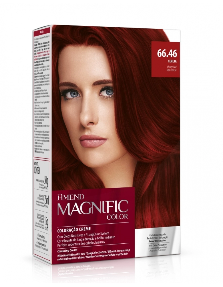 Kit Coloração Amend Magnific Color 66.46 Cereja uma coloração em creme que possibilita cores vibrantes de longa duração e brilho radiante. Sua fórmula é enriquecida com Proteína do Arroz que possui efeito restaurador e protetor, ou seja, a cor dos seus cabelos é renovada e a estrutura capilar preservada. Perfeita cobertura dos cabelos brancos. Finalize o processo de coloração com chave de ouro. Hidrate seus cabelos com concentrado protetor pós coloração color protection. Através de agentes repositores ele atua no fio em profundidade. Repõe a massa capilar protéica e aminoácidos perdidos, promovendo cabelos saudáveis e resistentes. Cabelos e cor protegidos por mais tempo!