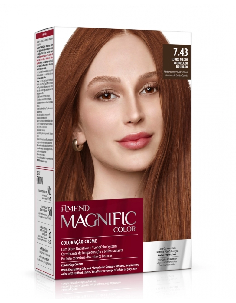 Kit Coloração Amend Magnific Color 7.43 Louro Médio Acobreado uma coloração em creme que possibilita cores vibrantes de longa duração e brilho radiante. Sua fórmula é enriquecida com Proteína do Arroz que possui efeito restaurador e protetor, ou seja, a cor dos seus cabelos é renovada e a estrutura capilar preservada. Perfeita cobertura dos cabelos brancos. Finalize o processo de coloração com chave de ouro. Hidrate seus cabelos com concentrado protetor pós coloração color protection. Através de agentes repositores ele atua no fio em profundidade. Repõe a massa capilar protéica e aminoácidos perdidos, promovendo cabelos saudáveis e resistentes. Cabelos e cor protegidos por mais tempo!