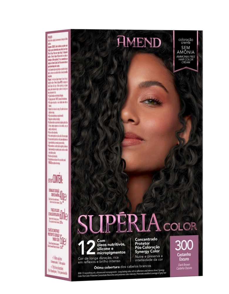 Kit Tonalizante Amend Supéria Color 300 Castanho Escuro sua fórmula creme sem Amônia colore os cabelos com cores modernas, ricas em reflexos naturais e brilho intenso, sem agredir a integridade da estrutura capilar durante o processo de coloração. Contém Micropigmentos que penetram no interior do fio e Silicones que blindam a camada externa, proporcionando cor e brilho de longa duração. Promove ótima cobertura dos cabelos brancos e não resseca os fios. Pode ser aplicada em cabelos naturais, com mechas, coloridos, descoloridos, inclusive os alisados, relaxados ou com escovas progressivas. Através do Concentrado Protetor Pós Coloração Synergy Color, mantenha os cabelos com cores cheias de vida, sedosos e brilhantes, Rico em Fosfolipídios de Girassol, o Concentrado Protetor revigora, nutre profundamente e preserva a intensidade da cor retendo os pigmentos por mais tempo no interior da fibra capilar.