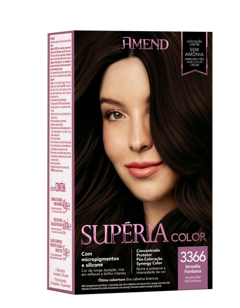 Kit Tonalizante Amend Supéria Color 3366 Vermelho Framboesa sua fórmula creme sem Amônia colore os cabelos com cores modernas, ricas em reflexos naturais e brilho intenso, sem agredir a integridade da estrutura capilar durante o processo de coloração. Contém Micropigmentos que penetram no interior do fio e Silicones que blindam a camada externa, proporcionando cor e brilho de longa duração. Promove ótima cobertura dos cabelos brancos e não resseca os fios. Pode ser aplicada em cabelos naturais, com mechas, coloridos, descoloridos, inclusive os alisados, relaxados ou com escovas progressivas. Através do Concentrado Protetor Pós Coloração Synergy Color, mantenha os cabelos com cores cheias de vida, sedosos e brilhantes, Rico em Fosfolipídios de Girassol, o Concentrado Protetor revigora, nutre profundamente e preserva a intensidade da cor retendo os pigmentos por mais tempo no interior da fibra capilar.