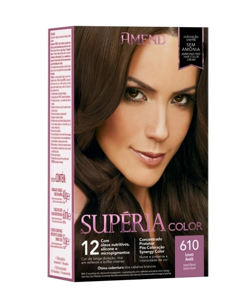 Kit Tonalizante Amend Supéria Color 610 Louro Avelã sua fórmula creme sem Amônia colore os cabelos com cores modernas, ricas em reflexos naturais e brilho intenso, sem agredir a integridade da estrutura capilar durante o processo de coloração. Contém Micropigmentos que penetram no interior do fio e Silicones que blindam a camada externa, proporcionando cor e brilho de longa duração. Promove ótima cobertura dos cabelos brancos e não resseca os fios. Pode ser aplicada em cabelos naturais, com mechas, coloridos, descoloridos, inclusive os alisados, relaxados ou com escovas progressivas. Através do Concentrado Protetor Pós Coloração Synergy Color, mantenha os cabelos com cores cheias de vida, sedosos e brilhantes, Rico em Fosfolipídios de Girassol, o Concentrado Protetor revigora, nutre profundamente e preserva a intensidade da cor retendo os pigmentos por mais tempo no interior da fibra capilar.