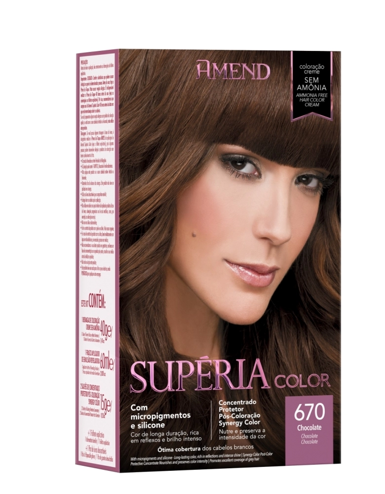 Kit Tonalizante Amend Supéria Color 670 Chocolate - Sua fórmula creme sem Amônia colore os cabelos com cores modernas, ricas em reflexos naturais e brilho intenso sem agredir a integridade da estrutura capilar durante o processo de coloração.Contém Micropigmentos que penetram no interior do fio e Silicones que blindam a camada externa, proporcionando cor e brilho de longa duração. Promove ótima cobertura dos cabelos brancos e não resseca os fios.Através do Tratamento Cosmético Pós Coloração Synergy Color, mantenha os cabelos com cores cheias de vida, sedosos e brilhantes, Rico em Fosfolipídios de Girassol, o tratamento cosmético revigora, nutre profundamente e preserva a intensidade da cor retendo os pigmentos por mais tempo no interior da fibra capilar.