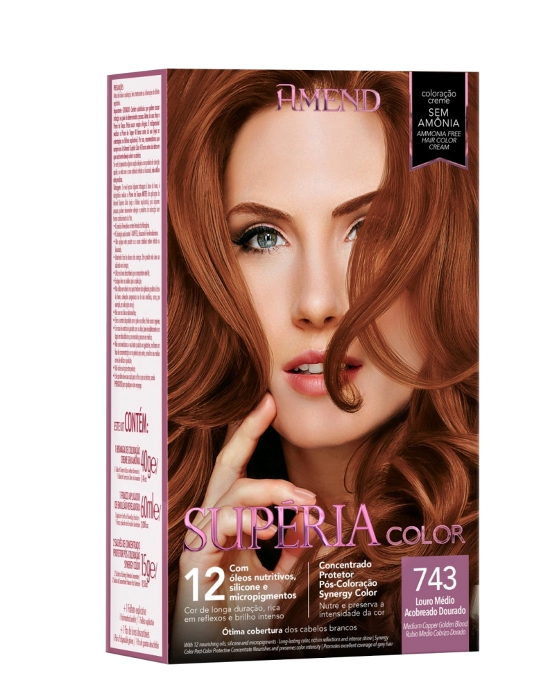 Kit Tonalizante Amend Supéria Color 743 Louro Médio Acobreado - Sua fórmula creme sem Amônia colore os cabelos com cores modernas, ricas em reflexos naturais e brilho intenso, sem agredir a integridade da estrutura capilar durante o processo de coloração. Contém Micropigmentos que penetram no interior do fio e Silicones que blindam a camada externa, proporcionando cor e brilho de longa duração. Promove ótima cobertura dos cabelos brancos e não resseca os fios. Pode ser aplicada em cabelos naturais, com mechas, coloridos, descoloridos, inclusive os alisados, relaxados ou com escovas progressivas. Através do Concentrado Protetor Pós Coloração Synergy Color, mantenha os cabelos com cores cheias de vida, sedosos e brilhantes, Rico em Fosfolipídios de Girassol, o Concentrado Protetor revigora, nutre profundamente e preserva a intensidade da cor retendo os pigmentos por mais tempo no interior da fibra capilar.