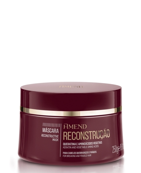Máscara Reconstrução Amend Essenciais possui queratina e aminoácidos vegetais presentes na fórmula, asseguram a restauração completa dos fios por dentro e por fora, evitando que o cabelo fique fraco, quebradiço e sem vida. A Máscara Amend Essenciais Reconstrução promove a restauração das regiões onde houve rompimento da cadeia peptídica, causada por agentes agressores como tensoativos, poluentes, alisantes e corantes, gerando o reequilíbrio do teor de água e aminoácidos dos fios, que ficarão totalmente condicionados, macios e regenerados.