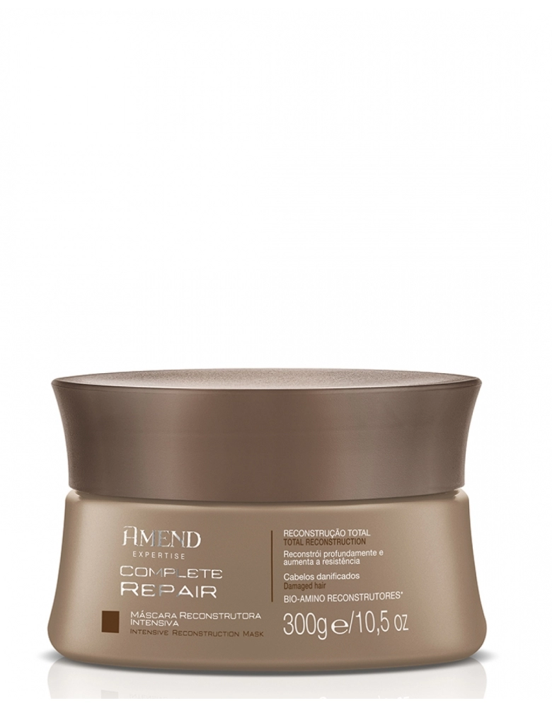 Máscara Reconstrutora Amend Expertise Complete Repairage no interior da fibra capilar. Com bio-amino reconstrutores que reparam danos, reconstroem as áreas fragilizadas e aumentam a resistência dos fios à quebra. Protege os cabelos de danos futuros.