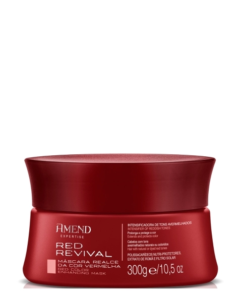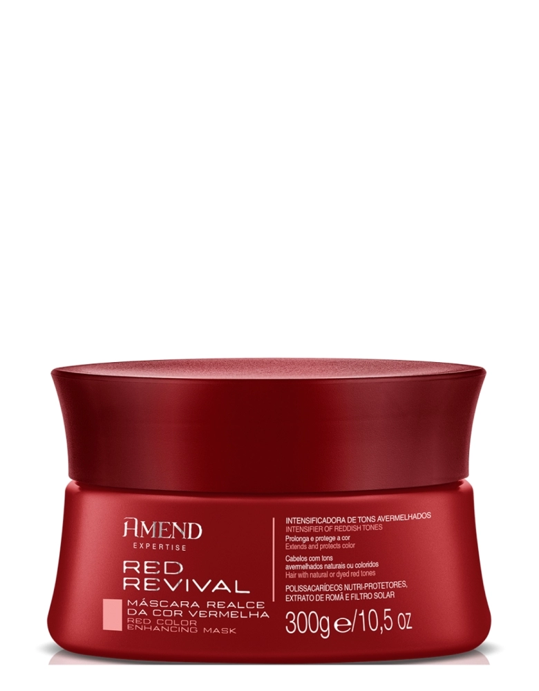 Máscara Realce da Cor Vermelha Amend Expertise Red Revivalfórmula com pigmentos vermelhos que intensificam e realçam a cor dos cabelos avermelhados. Enriquecida com filtro solar, que evita o desbotamento e ajuda a reter por mais tempo a cor nos fios.