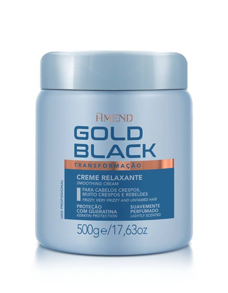 Creme Relaxante Amend Gold Black, essa linha foi desenvolvida com matérias primas especiais para o tratamento cosmético de cabelos crespos, muito crespos e rebeldes, deixando-os com aspecto brilhante, saudável e com balanço natural. O Creme Relaxante, cabelos crespos, muito crespos e rebeldes Gold Black, traz em sua fórmula os benefícios de um complexo de Queratina Hidrolisada e Quaternizada que além de penetrar facilmente na fibra capilar, hidratando, promove uma proteção extra durante o processo de relaxamento, evitando assim que o cabelo seja agredido e tornando-o macio e brilhante. É fácil de usar. Não contém soda. Contém Amônia. IMPORTANTE: Esse produto necessita de neutralização. É obrigatório o uso da Emulsão Neutralizante Gold Black, pois esta fixa o relaxamento no cabelo.